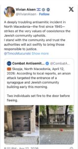 “Një incident thellësisht shqetësues antisemit në Maqedoninë e Veriut, i pari që nga viti 1945, godet vetë vlerat e bashkëjetesës që komuniteti hebre i vlerëson. Unë mbështes komunitetin dhe u bëj thirrje autoriteteve të vendit të nxjerrin përgjegjësit para drejtësisë”, tha ambasadori Eisen, i cili gjithashtu postoi videon në platformën X
