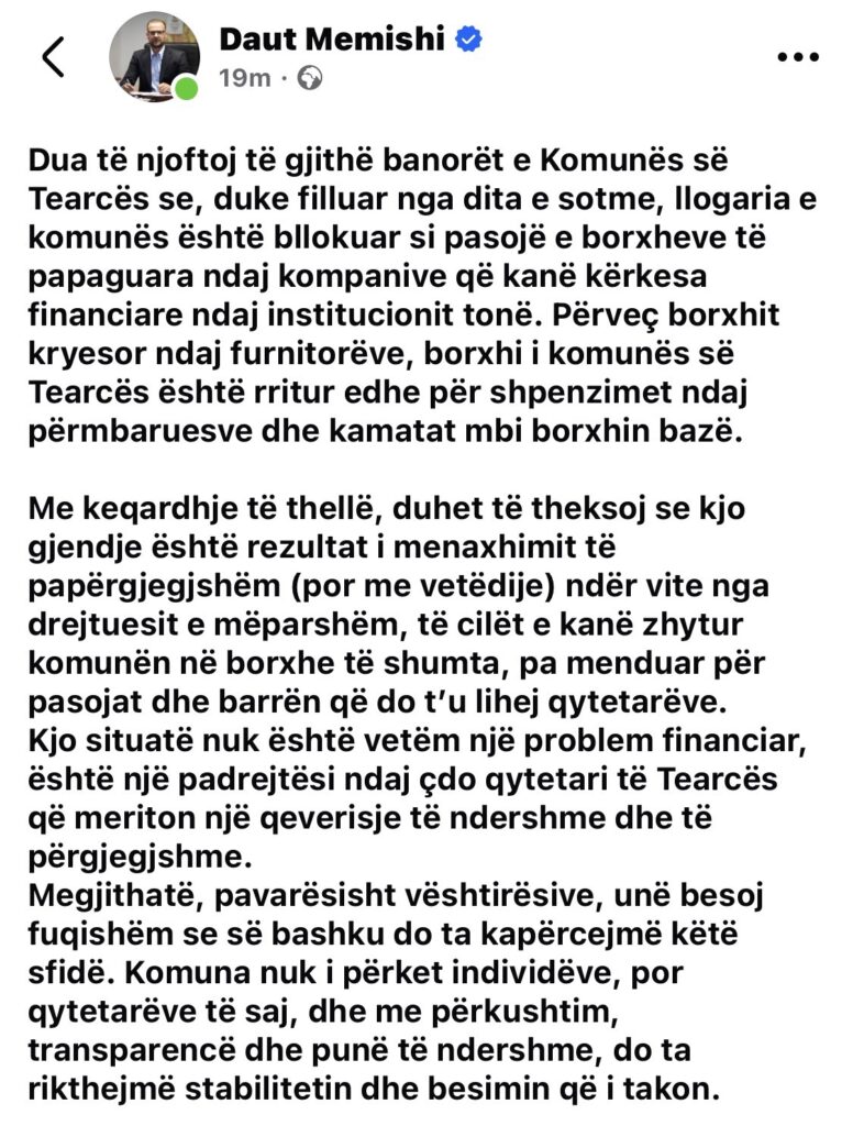 “Kjo nuk është vetëm një krizë financiare, por një padrejtësi ndaj qytetarëve të Tearcës, të cilët meritojnë transparencë dhe përgjegjësi në qeverisje”, thuhet në reagim.